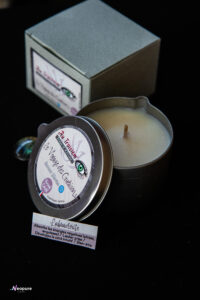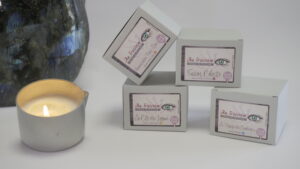Bougie de massage énergétique contenant une pierre aimantée de Labradorite au fond.