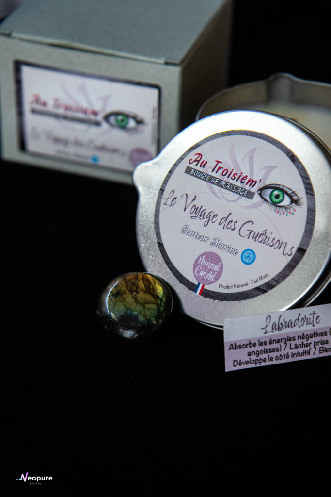 Plongez dans un voyage de guérison profonde avec les Mineral Candle - Le Voyage des Guérisons, des bougies de massage énergétique conçues avec des cires naturelles de soja, d'abeille, de végétales et d'huile de coco. Chaque bougie renferme en son cœur une pierre de labradorite, une gemme puissante et protectrice qui vous sera offerte en cadeau surprise et pourra également être portée comme une broche.